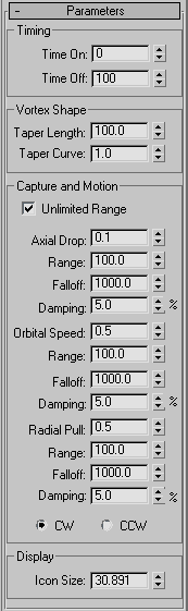 The space warp settings let you control the vortex shape, the well characteristics, and rate and range of particle capture. The shape of the vortex is also affected by particle system settings, such as speed.