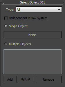 When chosen, you can specify a single default object in the scene by clicking the button, labeled "None" by default, and then selecting an object in the viewport. If you expose this parameter, the button is available to the user.