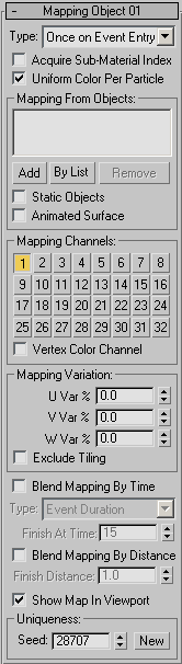 If a particle enters the event with mapping already assigned, you can blend the mapping values to avoid a jump in color. Blending can occur either by time or by distance from the reference geometry.