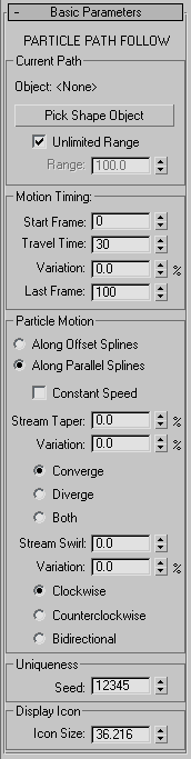 - Along Parallel Splines Particles follow a copy of the selected path, parallel to the particle system. In this mode, the position of the path relative to the particle system does not matter. The orientation of the path, however, affects the particle stream.