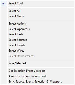 By default, the Select tool is active when Particle View is open, as indicated by the arrow-shaped mouse cursor. You can use this tool to highlight, move, and copy events, actions, tools, and wires. You can also use the commands on this menu to highlight all elements, no elements, or elements by category.