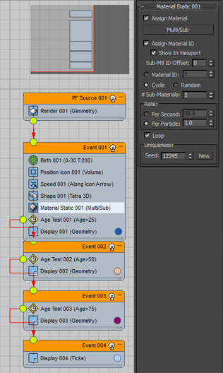 Particle Flow enhances event functionality to improve the overall handling of the materials in a system. It still does not allow particles to carry a material between events, but it provides an assortment of tools that simplify material assignment and inheritance.