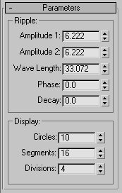 The Ripple space warp creates a concentric ripple through world space. It affects geometry and behaves the same as the Ripple modifier. Use the Ripple space warp when you want the ripple to affect a large number of objects, or to affect an object relative to its position in world space.