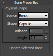For example, to apply capsule-shaped physical shapes to every bone and size them to fit the skin mesh, on the Bone Properties rollout set Source to Max Meshes and Shape to Capsule, then click Update All Bones.