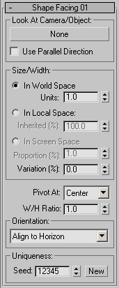 Use this control for defining the camera or object toward which the particle will face. This object is known as the Look At object. For the technically minded, the facing is maintained by keeping each particle's local Z axis pointed at the Look At object, or when Use Parallel Direction is on, aligned with the vector between the Particle Source icon and the Look At object.