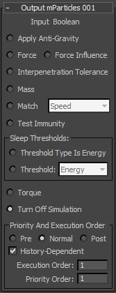The History-Dependent and Execution/Priority Order settings at the end of the Output mParticles rollout are the same as with any regular Output suboperator; for details, see Priority and Execution Order.