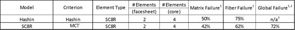 For this particular example problem, a converged solution could not be obtained using the Abaqus progressive damage model after the first localized matrix failure occurred. Consequently, the results reported here do not include a global structural failure load predicted with the Abaqus progressive damage model. The table below shows the load level at which each type of failure event is predicted using the two different progressive failure models. Recall that a converged solution could not be achieved using a progressive damage model after local matrix failure. By turning off the *DAMAGE EVOLUTION capability of the Abaqus progressive damage model and using the Hashin criterion to flag matrix and fiber failure without reducing the material stiffness after local failure, it is possible to determine approximately when fiber failure would occur. This value is approximate because a reduction in the material stiffness due to local matrix failure may cause fiber failure to initiate sooner.