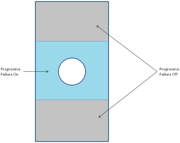 As an example, consider the open hole coupon shown below. Here, it is desired to deactivate progressive failure in the regions away from the stress concentration, which requires two different materials.