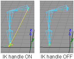 Click these buttons to turn the IK handle on or off. When the handle is turned off, it is still visible but has no effect on the IK chain. To hide it completely, click Invisible at the top of the IK handle section.