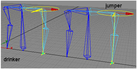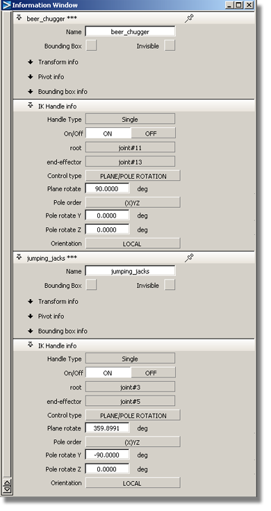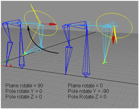 In this example, the two torsos are identical and both have IK handles on the left arms. The default value for Plane rotate is 90 degrees. The default value for Pole rotate Y and Z is zero degrees. The left torso requires a drinking motion, while the right torso will perform a jumping motion.