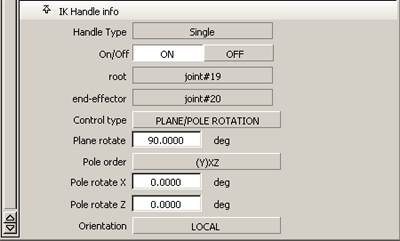 You will need to adjust the rotation of the Pole Axis, through the “Plane/Pole Rotation” setting, only if the skeleton chain is to be animated through an extremely wide range of motion in the scene. Specifically, if the limb axis of the chain comes near the Pole Axis, an undesirable “flipping” of the chain may occur; generally, you will want to move/animate the Pole Axis so that the handle’s limb axis does not come too close to it during a given scene.