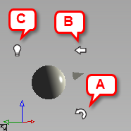 A. Curvy arrow: Reset the light to the camera position. Clicking this icon also sets the "home" view, as well as a new pivot location for the light to rotate around. The pivot location is the pivot point, if one exists, or tumble point otherwise.