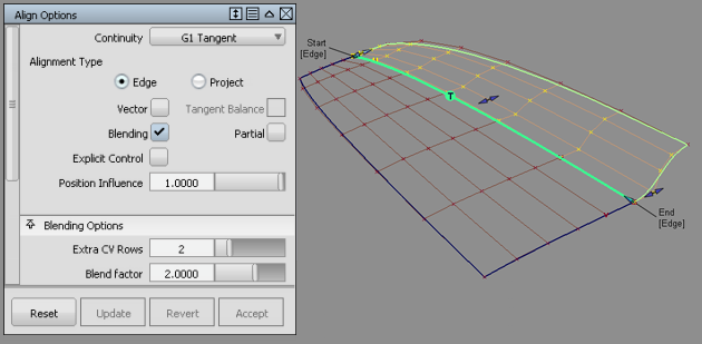 When Edge Align is selected and you are aligning to a natural surface boundary, you can turn on Tangent Balance to adjust the CVs on the tangent row so that the tangent lengths of the Input surface match those of the Master. The same applies to the curvature row CVs if G2 Curvature is on, and to the next row of CVs if G3 Curvature is on.