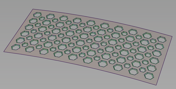 Below, the Array tool is used to create a grill array from a single hexagonal curve. The array of curves is then projected onto a surface. The surface is trimmed, and draft surfaces are built around the holes.