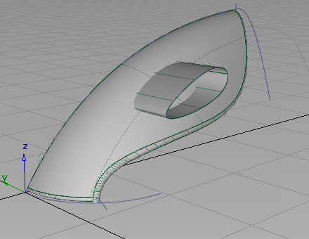 If the handle surface falls short of the body surfaces, use Pick > Object to select the second handle curve. Then, use Transform > Move with the to adjust the position of the curve. Because the skin surface has construction history, it is rebuilt to the new curve position when the mouse button is released.