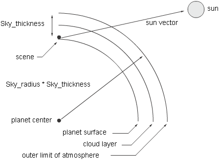 For example, if Sky_thickness is 1000 and Sky_radius is 50, the outer radius of the sky is 1000 x 50 = 50 000 units, and the radius of the planet is (1000 x 50) - (1000 x 1) = 49 000 units.