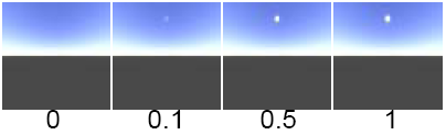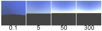 The density of the air in the atmosphere. The denser the air, the more light will be scattered. Think of air density in terms of low and high altitudes. High altitude skies are almost black straight up and blue near the horizon (the Air_density value less than 1). Low altitude skies are blue straight up and white near the horizon (the Air_density value greater than 1). The slider range is 0 to 3. The default value is 1.