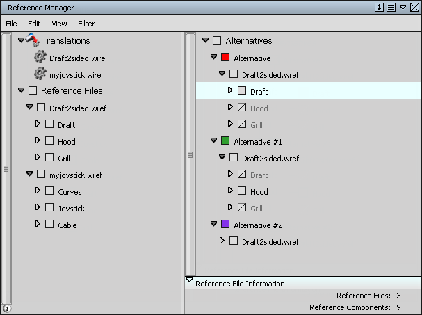 Shows both sides of the Reference Manager window (Reference Files and Alternatives).