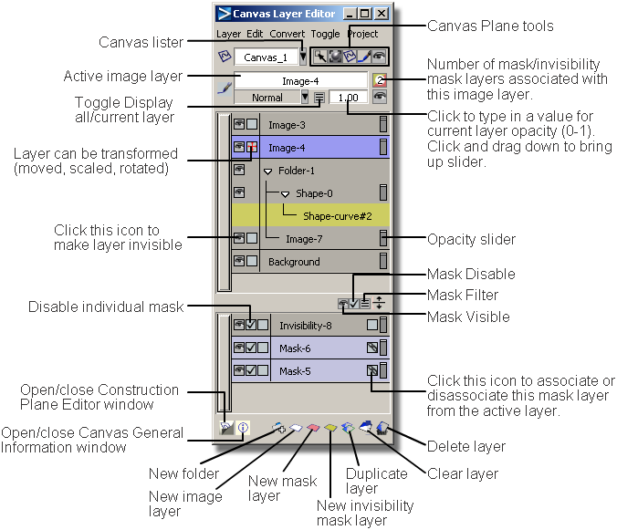 Only the layers on the currently active canvas are displayed. Drag the mouse over an icon to see a “tool tip” describing its purpose.