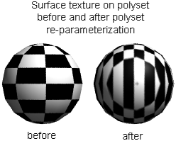 Re-parameterizes the selected meshes by mapping the vertices of the polygons to the Projection texture. A surface texture mapped to the re-parameterized mesh resembles a Projection texture.