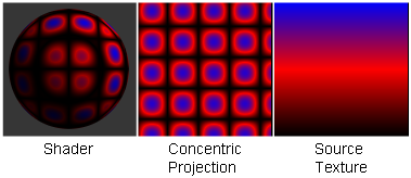 | CYLINDRICAL | Wraps the texture 360 degrees around the Y axis to form a cylinder located between -1 and 1 on the Y-axis. There are two pinch points at the -Y and +Y poles. |