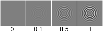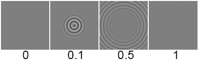 Controls the appearance of ripples over time. For example, if you relate the ripple effect to that of a water droplet falling into a glass of still water, at time 0 there is no ripple; the droplet has not touched the surface of the water yet. As the time parameter increases to a value greater than 0, the droplet has fallen onto the water surface and the ripple wave effect simulates the effect on the water in the glass at that point in time. When time has reached a value of 1, the effect of the droplet on the water surface is nearly complete and the water in the glass becomes still again.