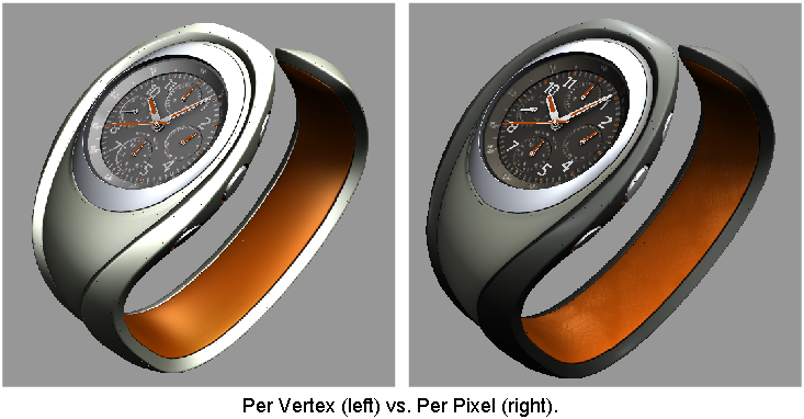 Per vertex provides you with the same quality of shaded mode as was available previously in Alias. Choose Per vertex for a fast approximation of the surface while modeling. Per pixel provides highlights close to the look obtained with the RayCaster, and requires a graphics card that supports this mode. For further information about qualified graphics cards, see http://www.alias.com/qual_charts/.