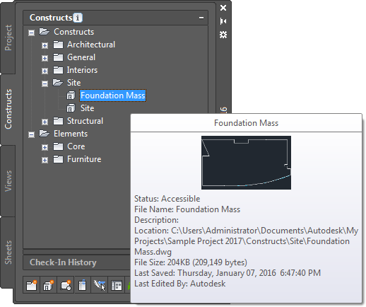 In the Project Navigator, you can display thumbnail previews of project drawings. The preview can be a graphic or a detail, or a combination of both. Displaying thumbnails can be helpful when you are navigating large projects with many drawings.
