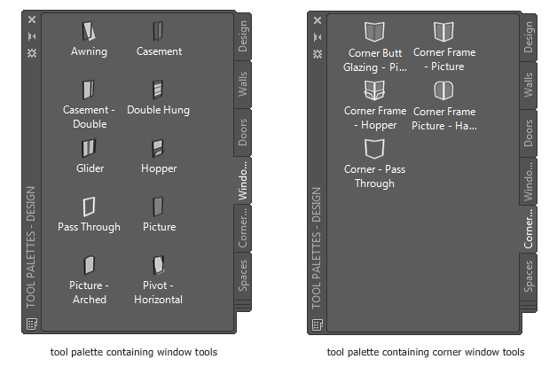| Custom tool palettes created by your CAD manager | window tools with window styles and properties that are customized for your projects or office standards |