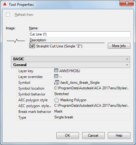 - Break line tools should have supporting elements stored in the same drawing as the break line symbol. As with other multi-component tools, such as schedule tags, it makes them easier to modify in the future. All of the properties for break marks are set in the tool properties, including whether or not the break mark masks or trims objects.