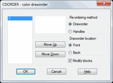 | Handles (Obsolete) | Arranges the drawing order of the selected objects by reordering objects in the drawing database. Objects are deleted and recreated in the order dictated by their color. |