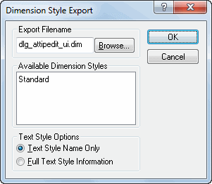 | Available Dimension Styles | Selects the dimension styles to write to the ASCII file. The current dimension styles are displayed. Each selected style is written to the file indicated in the Export Filename group. |