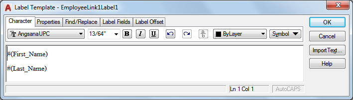 Applies a text style to the label. The current style is saved in the TEXTSTYLE system variable. Character formatting for font, height, and bold or italic attributes is overridden if you apply a new style to an existing label template. Stacking, underlining, and color attributes are retained in characters to which a new style is applied.Styles that have backward or upside-down effects are not applied. If a style defined with a vertical effect is applied to an SHX font, the text is displayed horizontally in the Label Template dialog box.