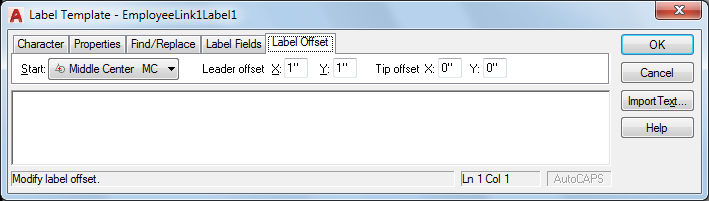 Specifies an X and Y offset for the multiline text object with respect to the associated leader object. By default, the X and Y Leader Offset options are set to 1, indicating that the label text is offset 1 unit in the X and Y planes from the tip of the leader object. The Leader Offset settings apply only to attached labels.