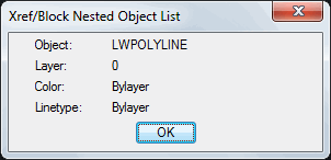 Lists the type, block name, layer name, color and linetype of a nested object in a block or an xref.