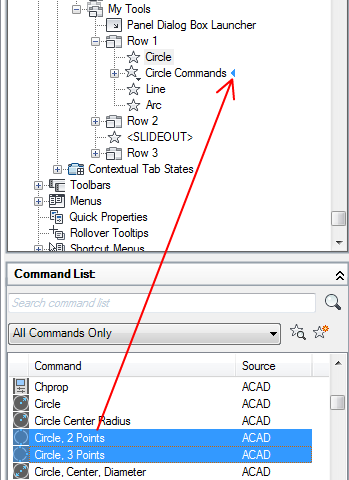 - Drag and drop a control from the Command list to a row in the ribbon panel.