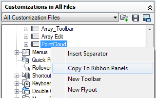 - Right-click the toolbar that you want to copy and convert to a ribbon panel. Click Copy to Ribbon Panels.