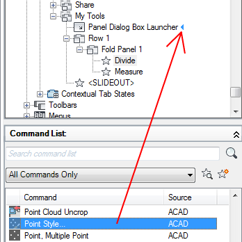 - Drag a command from the Command list to Panel Dialog Box Launcher on the panel.