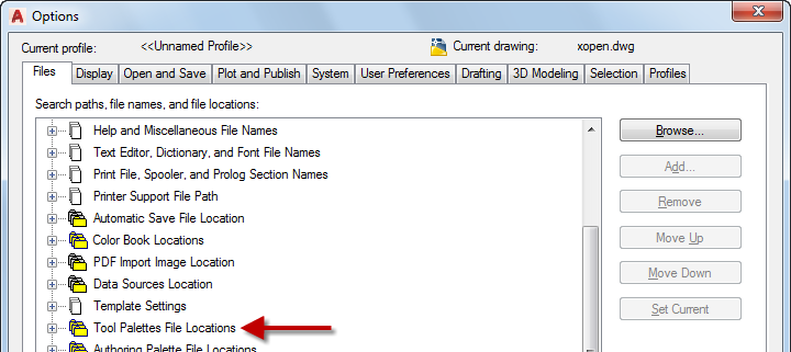 Tool palette files contain standard and user-defined tools. The files are stored in the locations specified by the Tool Palettes File Locations setting.