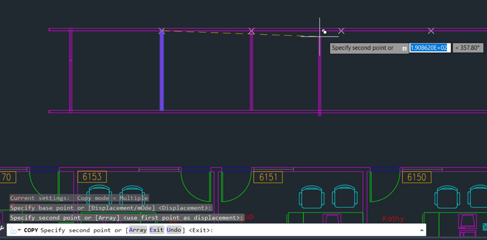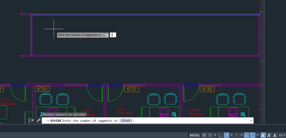 The line segment now has four points on it, marking it into five equal parts. It’s still just one line object. We didn’t break the line into four lines (we could use the BREAK or BREAKATPOINT commands for that), but instead we added four points on this object.