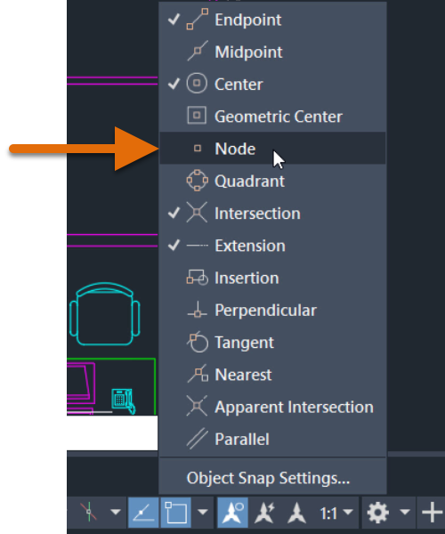 Now that the points are created, we’ll also want to make sure we have the Node Object Snap Mode turned on, so we can acquire those points.