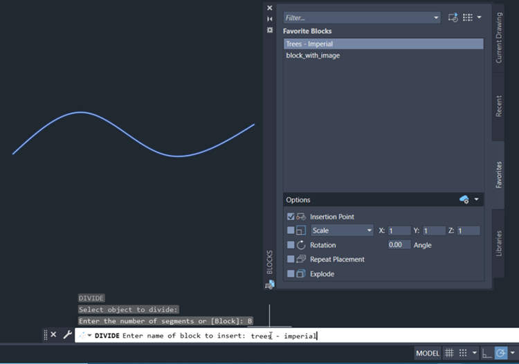 So far, we’ve used DIVIDE and MEASURE to place points on objects, but you can also use the Block option to place blocks along the length or perimeter of an object. In the following example, we’ll use DIVIDE to place five evenly spaced blocks (in this case, trees) along a spline.