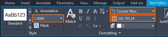 3. On the Text Editor ribbon contextual tab, do the following to change the formatting of the characters in the MText: