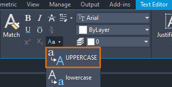 • On the Text Editor ribbon contextual tab, Tools panel, click All CAPS.