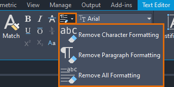 2. On the Text Editor ribbon contextual tab, Formatting panel, click Clear and choose from the available options: