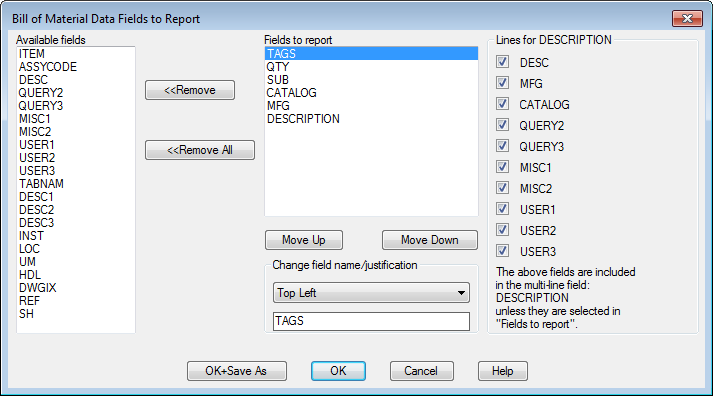 Change Report Fields: Opens a dialog box where you specify the fields to include in the report, field order, field labels, and text justification.