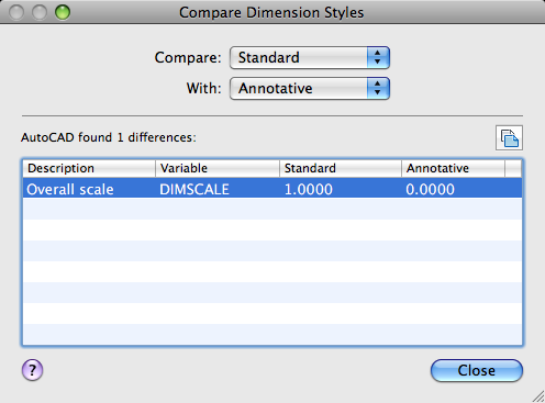 Displays the results of the dimension style comparison. If you compare two different styles, the properties that differ are displayed. If you set the second style to <none> or to the same style as the first, all the properties of the dimension style are displayed.