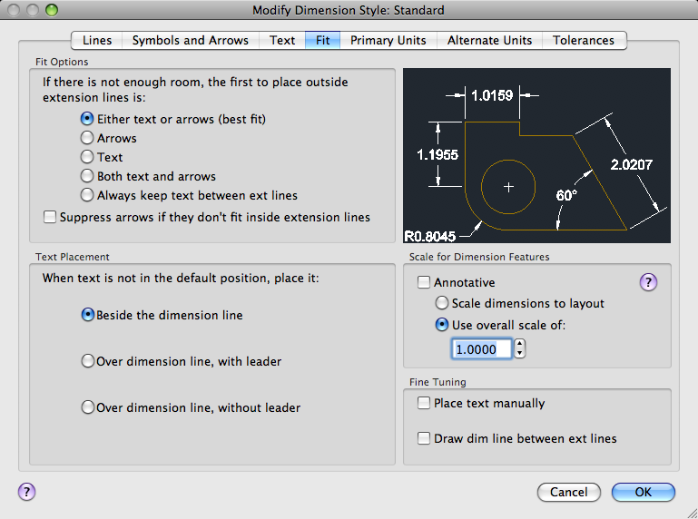 Controls the placement of dimension text, arrowheads, leader lines, and the dimension line.