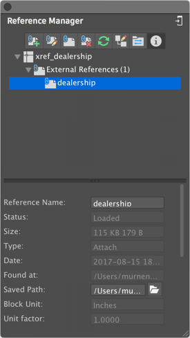The Reference Manager palette contains a toolbar along the top. You can right-click over the files list to display a shortcut menu that allows you to attach or manage an attached external reference. Click the Show Details button on the toolbar to view details and thumbnail preview for the selected external reference.