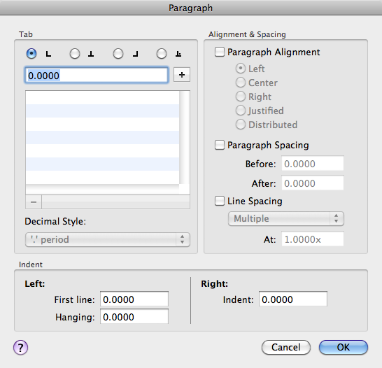 Displays tab setting options, including adding and removing tabs. Options include setting left, center, right, and decimal tabs. You can also set tabs from the Tab selection button on the In-Place Editor’s ruler.